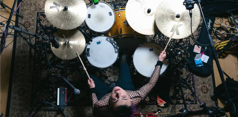 Overhead Drums: A shot of Connor from Flowvers recording the drums for the new songs, by Indy Brewer