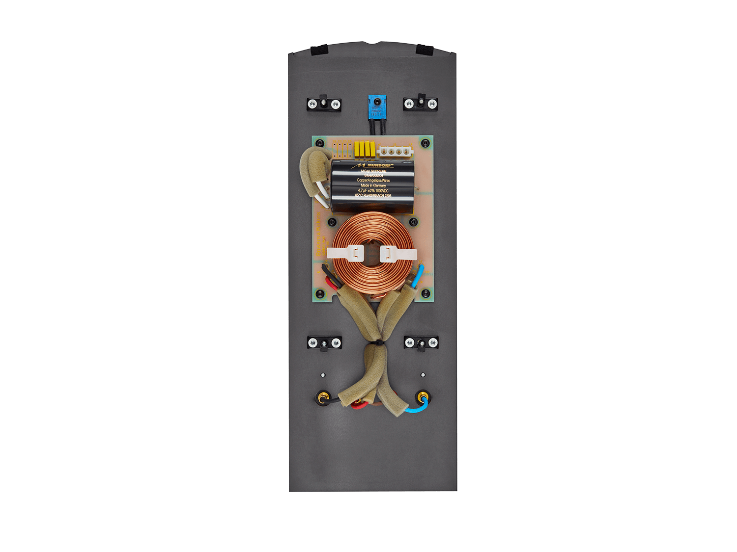 The new reverse-wrap orientation of the cabinet on 805 D4 means we can place its sensitive crossover components inside their own, dedicated space within the cabinet, which has critical benefits to both performance and serviceability. We’ve taken the opportunity to upgrade the speaker terminals, too.