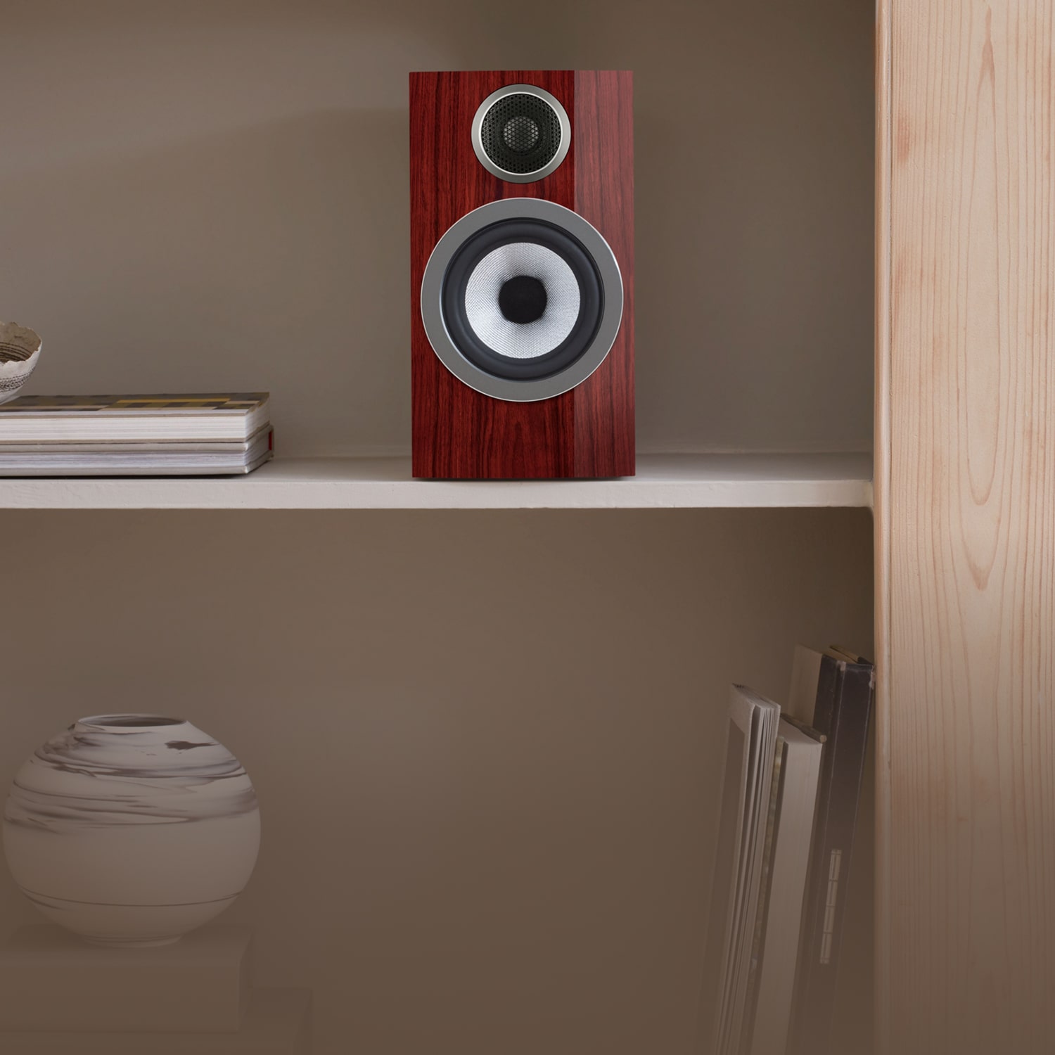 707 尊贵版不仅配备了精致的铝制铭牌,还独家采用了 Santos 高光饰面——这一奢华饰面的设计灵感源自为 805 D3 尊享版所选用的 Santos 玫瑰木。